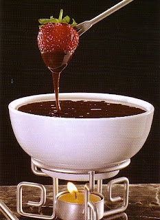 Fondue de Chocolate Podemos oferecer um licor para acompanhar. Este fondue nada mais é do que chocolate derretido, que fica na panela sobre o réchaud no meio da mesa. Coloque pedaços de frutas no seu pratinho individual, corte-os de um tamanho que possa ir à boca e, com o auxílio do espeto, mergulhe um de cada vez no chocolate. Gire o garfo especial longo para que o chocolate não pingue na mesa e leve-o até o pratinho individual.